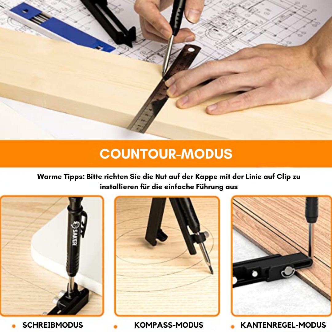 Verbessern Sie die Präzision und Vielseitigkeit Ihrer Holzbearbeitung mit dem Saker Pro™, einem Werkzeug, das alles verändert. Es geht über das Gewöhnliche hinaus und bietet einen sicheren Sitz mit einfacher Einstellung des Stifthalters und der Mutter, was verschiedene Markierungsanwendungen ermöglicht.